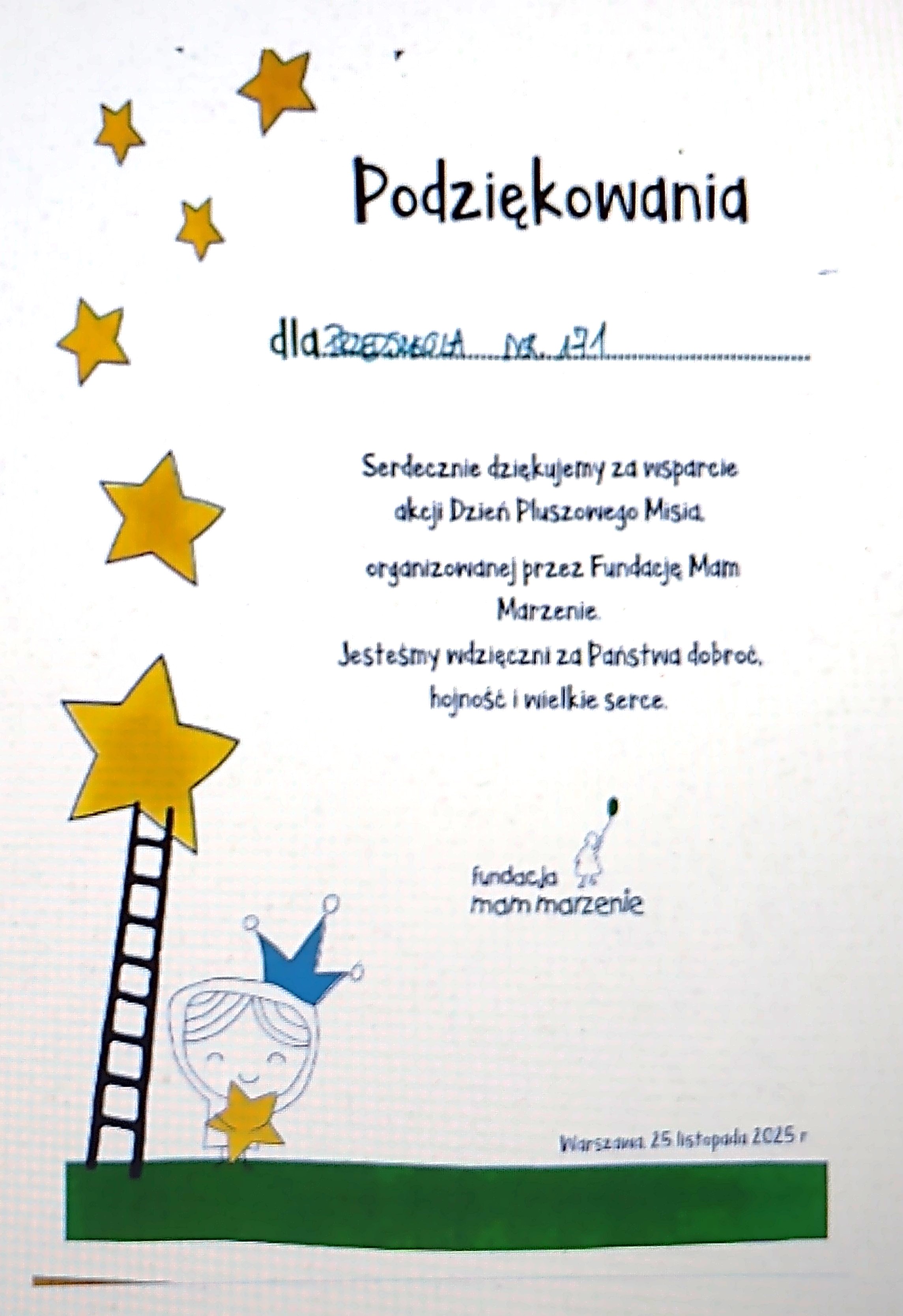 Bardzo dziękujemy za wsparcie zbiórki organizowanej w naszym przedszkolu z okazji dnia Pluszowego Misia na rzecz Fundacji “Mam Marzenie”.
