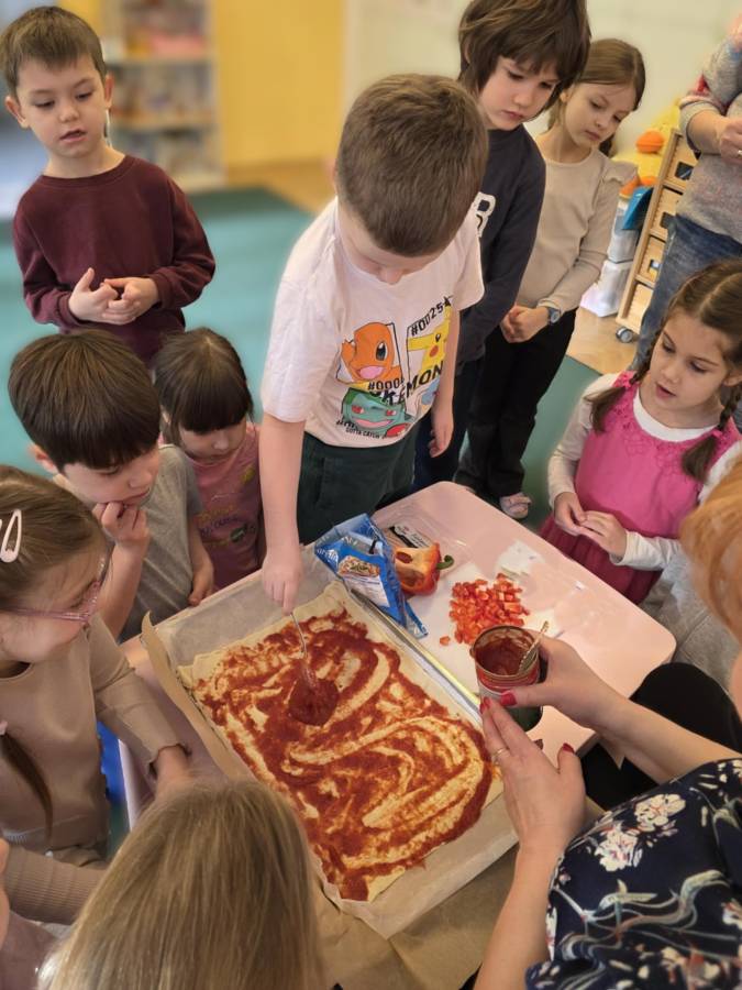 Dzień Pizzy w przedszkolu to był szereg różnych aktywności przybliżających dzieciom wiedzę na temat słynnego placka z sosem pomidorowym. Oczywiście najfajniejsze było przygotowowywanie własnej pizzy, a potem degustacja :)
